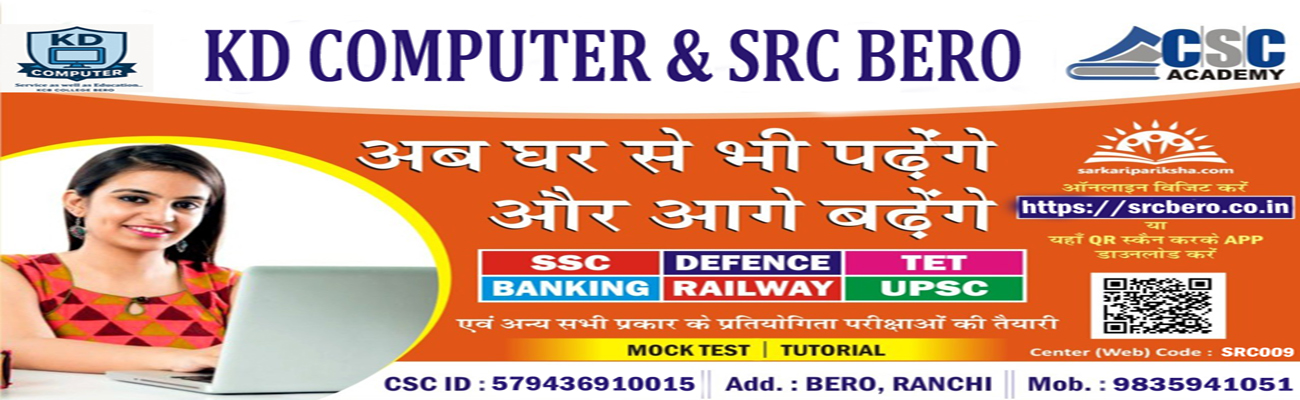 Welcome in KD Computer & SRC Bero, KD Computer & SRC Bero is stablish about in year of 2022. Here all type of Governmental and non governmental services are available, Specially College and University related services provided here. Some types of work is Educational services, Banking services, Insurance service, Voter Card Service, Passport service,PAN card services and many more services are successfully run here.